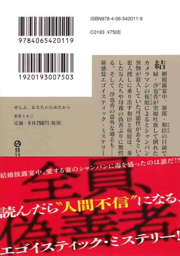 講談社文庫 夏原 エヰジ 講談社ゼンブアナタノタメダカラ ナツバラ エイジ 発行年月:2026年01月15日 ページ数:352p サイズ:文庫 ISBN:9784065420119 夏原エヰジ(ナツバラエイジ) 1991年生まれ。上智大学法学部卒業。2018年に「Cocoon」で第13回小説現代長編新人賞奨励賞を受賞。同作を改題した『Cocoon修羅の目覚め』で翌年デビュー。シリーズ化もされ、第二部である「Cocoon 京都・不死篇」や外伝を合わせ、計11冊を刊行した(本データはこの書籍が刊行された当時に掲載されていたものです) 結婚披露宴中、新郎・和臣の目前で新婦・沙也香が突如吐血して倒れた。カメラマンの桜庭によるとシャンパンに異物が混入していた可能性があるという。犯人捜しに乗り出す和臣と桜庭は、参列した友人たちや母親の偽善ぶりに驚愕する。そして、沙也香の意外な過去もー。新感覚エゴイスティック・ミステリー! 本 小説・エッセイ ノンフィクション 文庫(ノンフィクション) 小説・エッセイ 日本の小説 著者名・な行 文庫 小説・エッセイ 文庫 人文・思想・社会