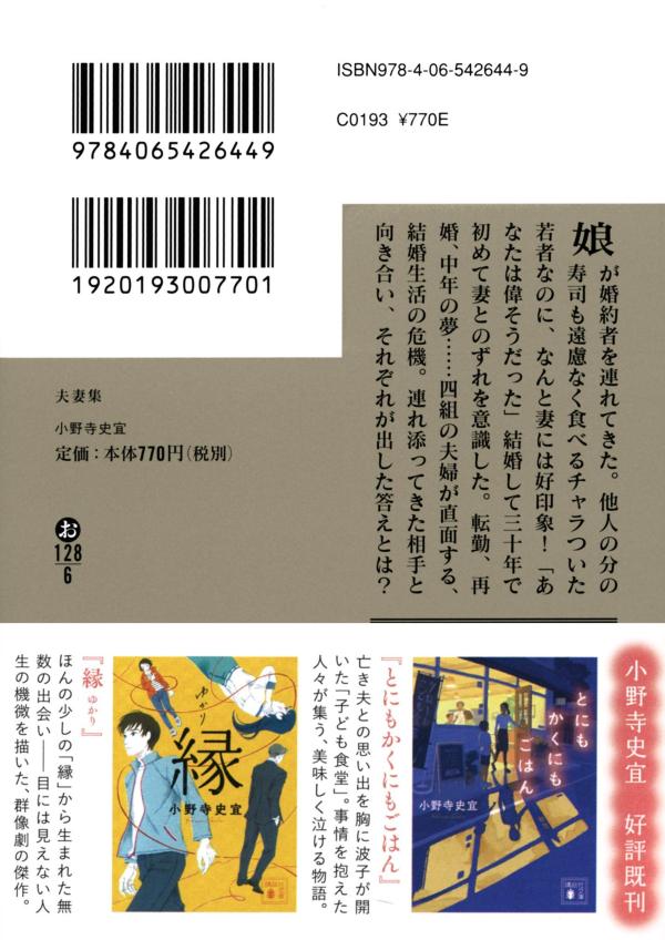 講談社文庫 小野寺 史宜 講談社フサイシュウ オノデラ フミノリ 発行年月:2026年02月13日 ページ数:368p サイズ:文庫 ISBN:9784065426449 小野寺史宜(オノデラフミノリ) 1968年千葉県生まれ。2006年「裏へ走り蹴り込め」で第86回オール讀物新人賞を受賞してデビュー。2008年『ROCKER』で第3回ポプラ社小説大賞優秀賞を受賞。2019年に『ひと』が本屋大賞第2位に選ばれ、ベストセラーに(本データはこの書籍が刊行された当時に掲載されていたものです) 娘が婚約者を連れてきた。他人の分の寿司も遠慮なく食べるチャラついた若者なのに、なんと妻には好印象!「あなたは偉そうだった」結婚して三十年で初めて妻とのずれを意識した。転勤、再婚、中年の夢…四組の夫婦が直面する、結婚生活の危機。連れ添ってきた相手と向き合い、それぞれが出した答えとは? 本 小説・エッセイ ノンフィクション 文庫(ノンフィクション) 小説・エッセイ 日本の小説 著者名・あ行 文庫 小説・エッセイ 文庫 人文・思想・社会