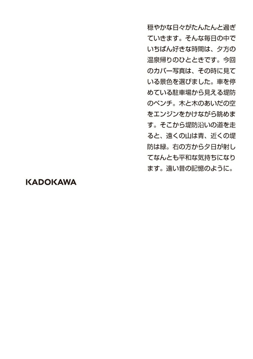 角川文庫 銀色 夏生 KADOKAWAクウキノナカニタダヨウヨウニソンザイスル ツレヅレノート48 ギンイロ ナツヲ 発行年月:2025年10月24日 予約締切日:2025年08月30日 ページ数:320p サイズ:文庫 ISBN:9784041167779 穏やかな日々がたんたんと過ぎていきます。そんな毎日の中でいちばん好きな時間は、夕方の温泉帰りのひとときです。今回のカバー写真は、その時に見ている景色を選びました。車を停めている駐車場から見える堤防のベンチ。木と木のあいだの空をエンジンをかけながら眺めます。そこから堤防沿いの道を走ると、遠くの山は青、近くの堤防は緑。右の方から夕日が射してなんとも平和な気持ちになります。遠い昔の記憶のように。 本 小説・エッセイ エッセイ エッセイ 小説・エッセイ ノンフィクション 文庫(ノンフィクション) 文庫 人文・思想・社会