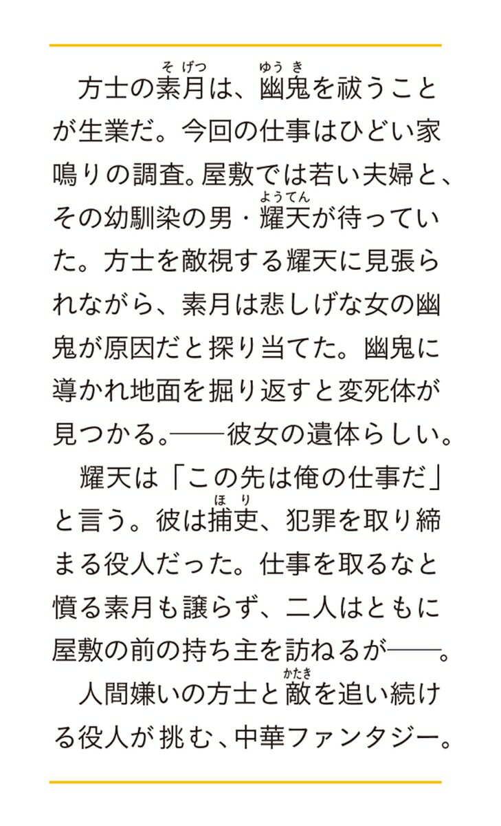 富士見L文庫 深海 亮 久賀 フーナ KADOKAWAゲッカノホウシ ヨミモドリノニエハヤミヲハラウ フカウミ トオル クガ フーナ 発行年月:2024年09月13日 予約締切日:2024年09月12日 ページ数:288p サイズ:文庫 ISBN:9784040755748 深海亮(フカウミトオル) 圧倒的な登場人物の魅力と、先が気になるストーリー展開で読者を引きつけてやまない(本データはこの書籍が刊行された当時に掲載されていたものです) 方士の素月は、幽鬼を祓うことが生業だ。今回の仕事はひどい家鳴りの調査。屋敷では若い夫婦と、その幼馴染の男・耀天が待っていた。方士を敵視する耀天に見張られながら、素月は悲しげな女の幽鬼が原因だと探り当てた。幽鬼に導かれ地面を掘り返すと変死体が見つかる。ー彼女の遺体らしい。耀天は「この先は俺の仕事だ」と言う。彼は捕吏、犯罪を取り締まる役人だった。仕事を取るなと憤る素月も譲らず、二人はともに屋敷の前の持ち主を訪ねるがー。人間嫌いの方士と敵を追い続ける役人が挑む、中華ファンタジー。 本 ライトノベル その他