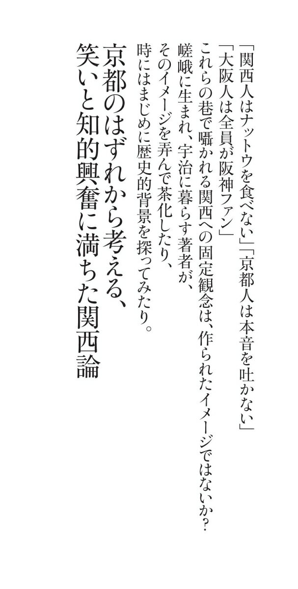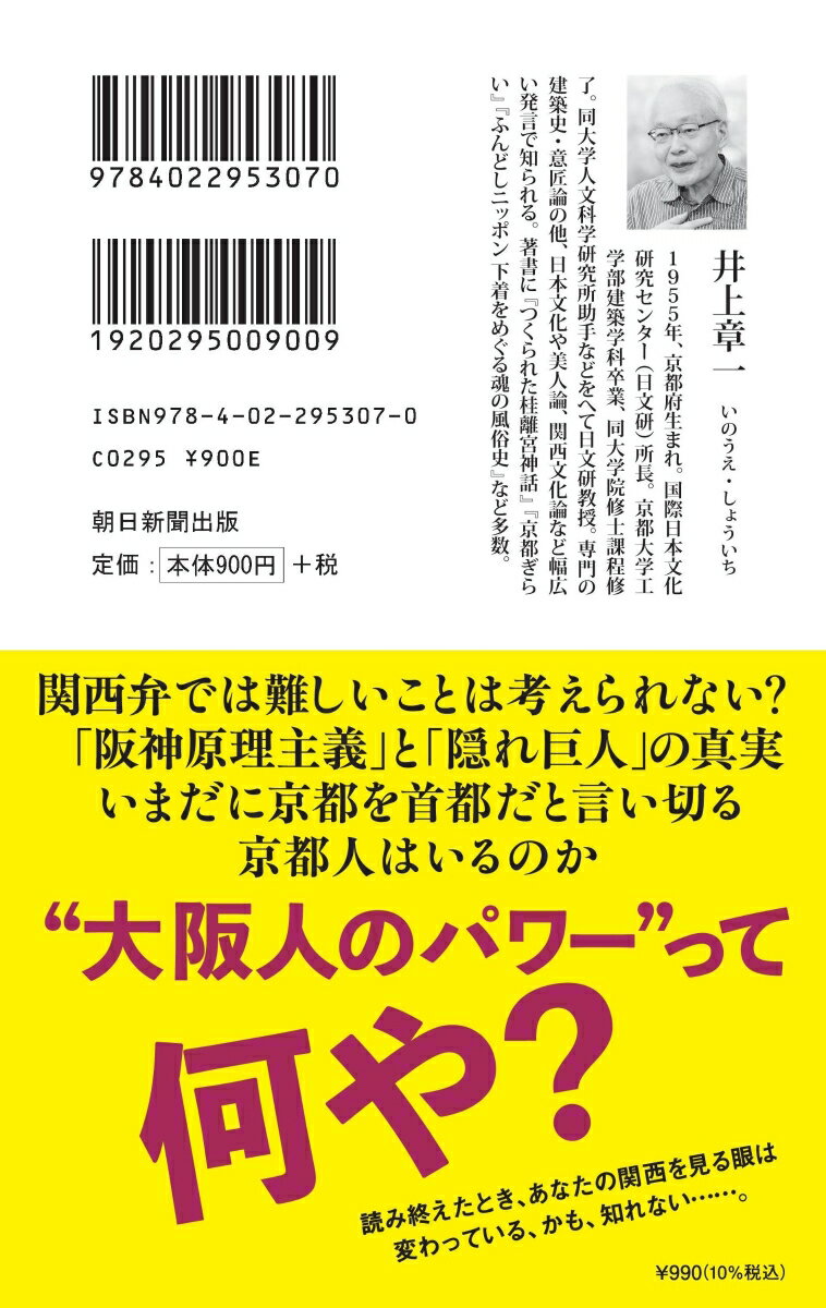 朝日新書992 井上章一 朝日新聞出版カンサイジンノショウタイ<ゾウホバン> イノウエショウイチ 発行年月:2025年03月13日 予約締切日:2025年03月12日 ページ数:280p サイズ:新書 ISBN:9784022953070 井上章一(イノウエショウイチ) 1955年、京都府生まれ。国際日本文化研究センター(日文研)所長。京都大学工学部建築学科卒、同大学院修士課程修了。京都大学人文科学研究所助手をへて日文研教授。専門の建築史・意匠論のほか、日本文化について、あるいは美人論、関西文化論などひろい分野にわたる発言で知られる(本データはこの書籍が刊行された当時に掲載されていたものです) 第一章 関西弁の真実(きたない!?関西弁/関西弁は議論に向かないという知識人 ほか)/第二章 大阪の正体(“大阪のパワー”と人がいうとき/“風俗発祥の地・大阪”というぬれぎぬ ほか)/第三章 京都の正体(辺境文化の光と影/京都の景観なんて、どうでもいい ほか)/第四章 関西全体への大誤解(値切れる関西人/近畿のほんとうの意味 ほか)/ボーナストラック 三たびの復刊によせてー五五年ぶりの万国博ー 「関西人はナットウを食べない」「京都人は本音を吐かない」「大阪人は全員が阪神ファン」これらの巷で囁かれる関西への固定観念は、作られたイメージではないか?嵯峨に生まれ、宇治に暮らす著者が、そのイメージを弄んで茶化したり、時にはまじめに歴史的背景を探ってみたり。京都のはずれから考える、笑いと知的興奮に満ちた関西論。 本 小説・エッセイ エッセイ エッセイ 人文・思想・社会 社会 社会学 新書 その他