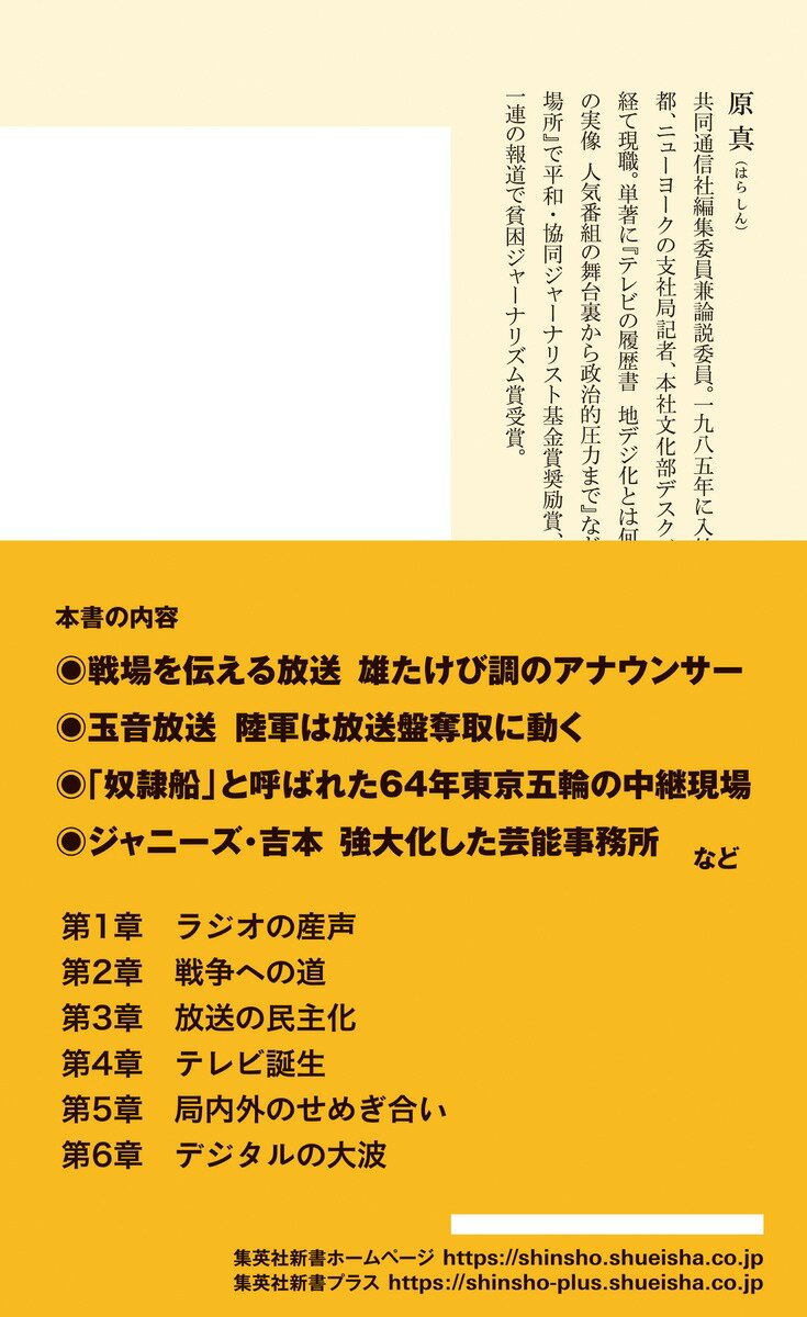 集英社新書 原 真 集英社オトトヒカリノセイキ/ラジオ テレビノヒャクネンシ ハラ シン 発行年月:2025年12月17日 予約締切日:2025年12月16日 ページ数:232p サイズ:新書 ISBN:9784087213928 原真(ハラシン) 共同通信社編集委員兼論説委員。1985年に入社後、岐阜、仙台、京都、ニューヨークの支社局記者、本社文化部デスク、富山支局長などを経て現職。編著『わたしの居場所』で平和・協同ジャーナリスト基金賞奨励賞、入管政策についての一連の報道で貧困ジャーナリズム賞受賞(本データはこの書籍が刊行された当時に掲載されていたものです) 第1章 ラジオの産声/第2章 戦争への道/第3章 放送の民主化/第4章 テレビ誕生/第5章 局内外のせめぎ合い/第6章 デジタルの大波 一九二五年三月二二日の日本における放送開始から百年。二・二六事件、太平洋戦争、戦後の民主化、高度経済成長、そしてデジタル革命…激動の近現代の中でラジオ・テレビはどのように発達し、日本社会にどのような影響を与えてきたのか?著者はメディアの変遷について四〇年間取材しつづけてきたジャーナリスト。本書は挑戦と葛藤に満ちた放送の現場を知る当事者や関係者の証言を多数収録。個々の番組内容だけでなく、技術、制度、ビジネスといった多様な側面にも触れた、日本放送史の決定版! 本 ビジネス・経済・就職 産業 運輸・交通・通信 人文・思想・社会 歴史 日本史 新書 その他