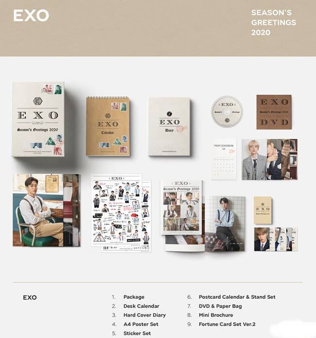 タイトル:EXO(エクソ) 2020 Season's Greetings 発売日:2019-12-17 パッケージの重量:1580 g 内容物 1. Package: 220 X 310 X 88mm 2. Postcard Calendar & Stand Set: 101 X 160mm / 12pcs 3. DVD & Paper Bag: 26min / 125 X 130mm / 1ea 4. Desk Calendar: 170 X 230mm / 14p 5. Sticker Set (Photo & Handwriting): 200 X 287mm / 2pcs 6. A4 Poster Set: 200 X 287mm / 12pcs 7. Hard Cover Diary: 174 X 233mm / 120p 8. Mini Brochure: 174 X 233mm / 12p 9. Fortune Card Set Ver.2 "PRODUCT 55 X 85mm / 24ea 1set PACKAGE 55 X 88 X 13mm"