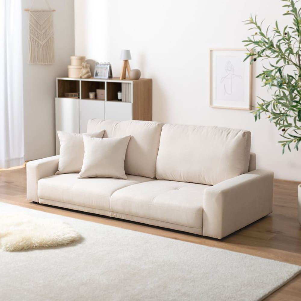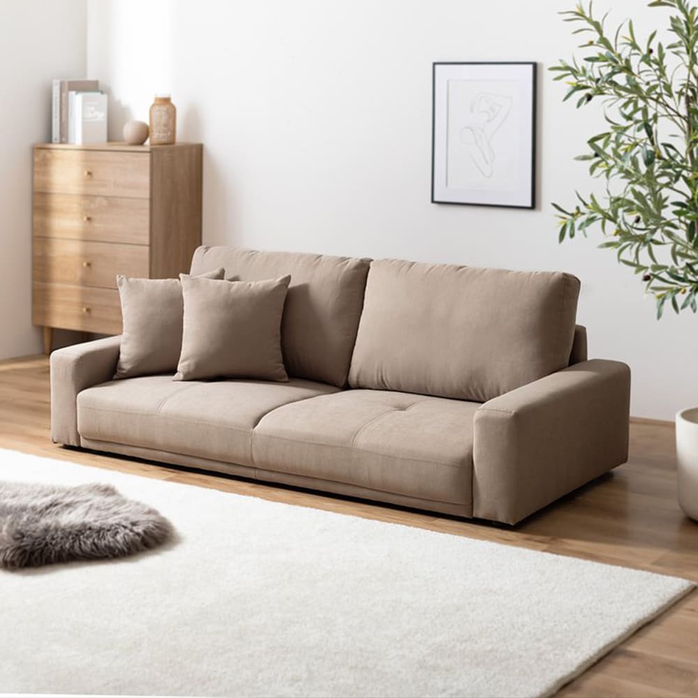【要確認】 (メール便対象●ポイント)と記載の商品はメール便対象です。 こちら上記の記載が無い商品はメール便での発送は不可となります。 ※商品名記載のポイント数が合計10ポイント以内はメール便発送となります。 参照:メール便について コレクション アンココン uncocon こちらの商品は代引き決済不可商品となります。 品番:m14231 在庫のある場合は、3~5営業日で発送いたします。 (「発送」であり「お届け」ではございませんのでご注意ください) こちらの商品の配送料は無料となります。 (北海道・沖縄・離島への配送は、送料別途お見積りとなります) ※購入前に事前確認も可能となりますので、お電話(075-366-3835)またはメールにて、お気軽にお問合せくださいませ。 ■おすすめポイント 家族のくつろぎにちょうどいい、『Shkuran(シュクラン)2.5人掛けローソファ』。 ベーシックでシンプルなデザインが北欧インテリアやナチュラル家具にもなじみ、リビングをすっきり広く見せます。 低め設計で圧迫感を抑え、小さなお子様やペットのいるご家庭にも安心。 毎日のリラックスタイムをやさしく支える一台です。 こちらでは 2.5人掛けタイプ をご購入いただけます。 どんなお部屋にも合わせやすい、シンプルでベーシックな『Shkuran(シュクラン)2.5人掛けローソファ』。 幅166cmのゆったりサイズで、2人で並んで座っても窮屈感が少なく、自然と体をあずけてくつろげます。 座面は奥行約46cmと広く、横になってごろ寝もできる設計。 リビングでの読書や映画時間を、より快適にしてくれます。 座面高は約19cmのロータイプ。 視線が低くなることで空間に抜け感が生まれ、お部屋を広く見せる効果がありワンルームやマンションにもおすすめです。 床との段差が少ないため、立ち座りもしやすく、小さなお子様やペットのいるご家庭でも安心してお使いいただけます。 背面まできれいに仕上げているため、間仕切りとして置くレイアウトも可能。 ダイニングとリビングをゆるやかに分ける家具としても活躍します。 フラットなアームレストは肘を置いたり、スマホやリモコンを置いたりと実用的。 ナチュラル、北欧、モダンなど幅広いインテリアに合うデザインで、ローテーブルやこたつとも相性抜群。 家族みんなが安心して使える、毎日の暮らしに寄り添うローソファです。 サイズ ■本体サイズ 幅166cm×奥行71cm×高さ59cm×座面高19cm ■本体重量 約27.8kg ■耐荷重 約200kg ■梱包サイズ 141cm×63cm×43cm ■梱包重量 約30.6kg 素材 【張地】ポリエステル 【本体】ウレタンフォーム、Sバネ、ウェービングベルト、木枠 樹脂ゴム 生産国 中国 ご注意事項 ■組立品 ※組み立て時間:2人以上で約15分 ※商品の色味に関してましては、できる限り実物に近くなる様に努めておりますが、ご利用のモニターやデバイスの発色によりまして、実物と異なって見える場合がございます。